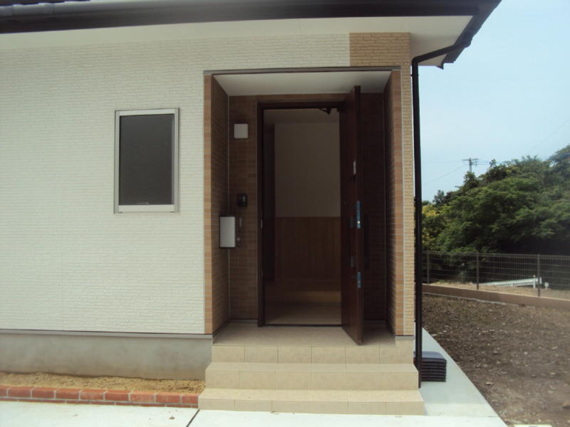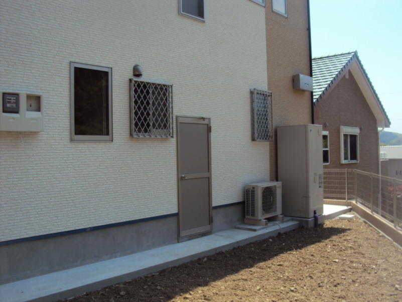 北側に階段下収納ドアが有、その右側にエコ給湯が設置されています